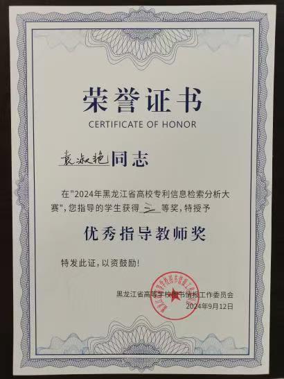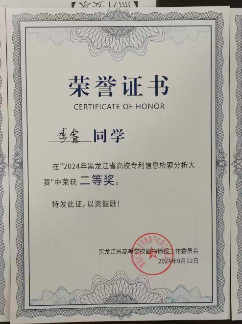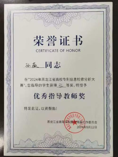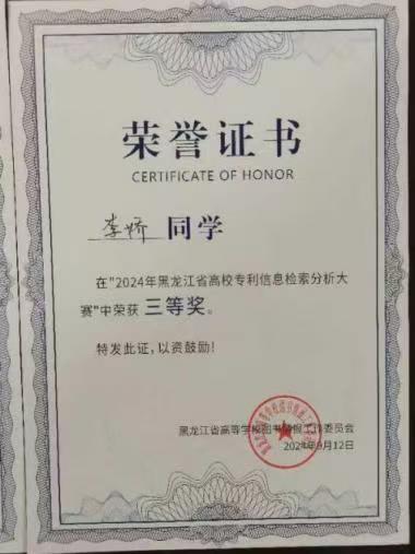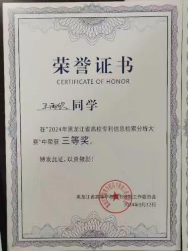 在大众创业、万众创新的时代背景下,为实现知识产权普及教育并提升专业领域人才的创新意识,促进黑龙江省高校知识产权工作的深入发展,2024年9月12日,伟德国际victor1946知识产权专业的三名员工及带队老师在黑龙江省高校专利信息检索分析大赛中表现出色,获省级二等奖一项,省级三等奖两项,优秀指导教师奖二项。