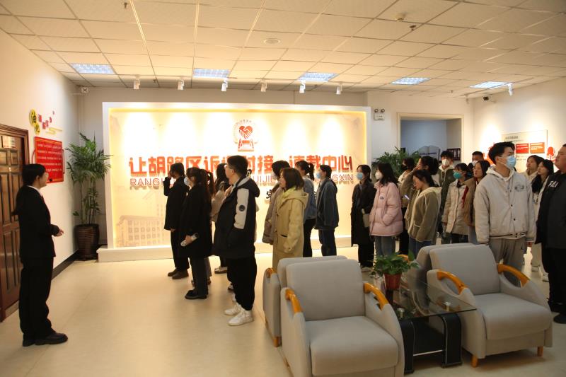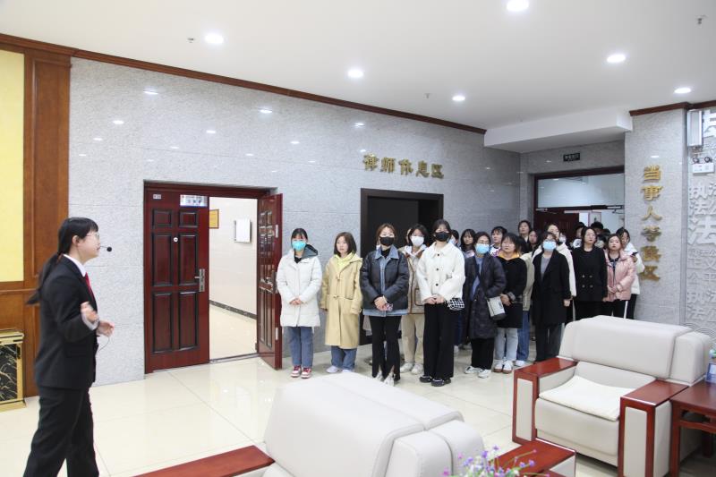 首先,同学们参观法院。当事人等候区、法院服务接待窗口、心理咨询室、荣誉墙、诉调对接中心——华姐调解室......跟随者工作人员热心地讲解,同学们漫步在法院的每一个角落,见到政法干警耐心倾听群众的诉求、看着荣誉墙上的一面面锦旗,同学们真真切切地感受到了“努力让人民群众在每一个司法案件中感受到公平正义”这句话的真正内涵。