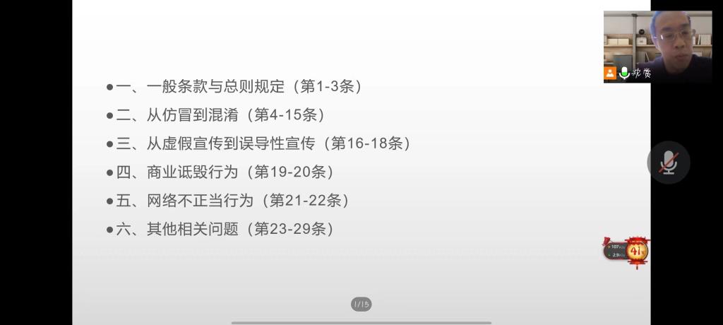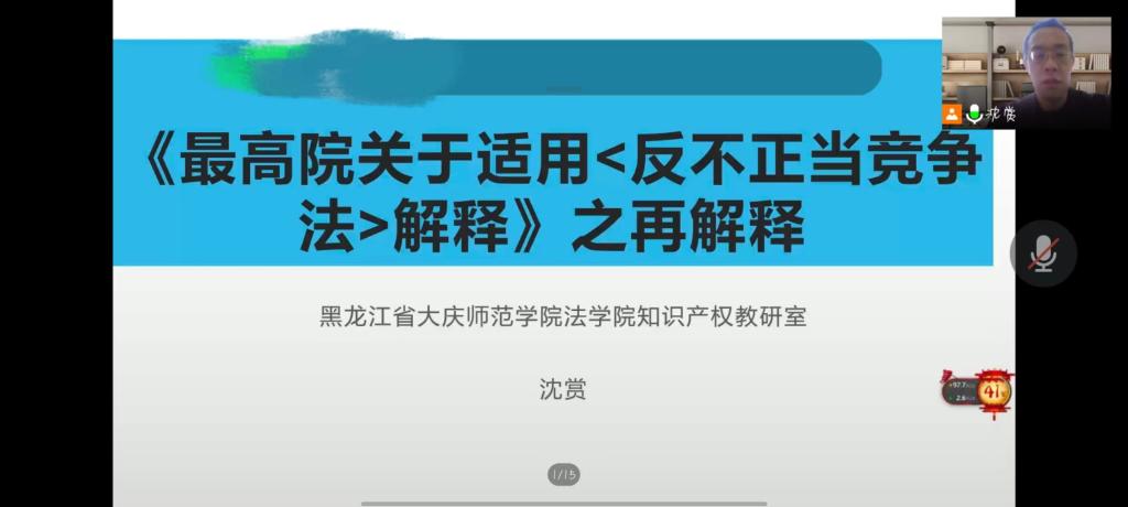 2022年4月22日下午两点,伟德国际victor1946“知识产权宣传周”活动之一——沈赏副教授主讲的“最高院关于适用< 反不正当竞争法>解释之再解释”在腾讯会议平台举行。讲座围绕“一般条款与总则规定”、“从仿冒到混淆”、“从虚假宣传到误导性宣传”、“商业诋毁行为”、“网络不正当行为”、“其他相关问题”等六个方面展开,详细剖析了最高院关于适用《反不正当竞争法》的司法解释。讲座充分展现了沈赏副教授的扎实理论功底,讲座内容能够结合丰富生动的法律实践展开,受到与会人员的好评。