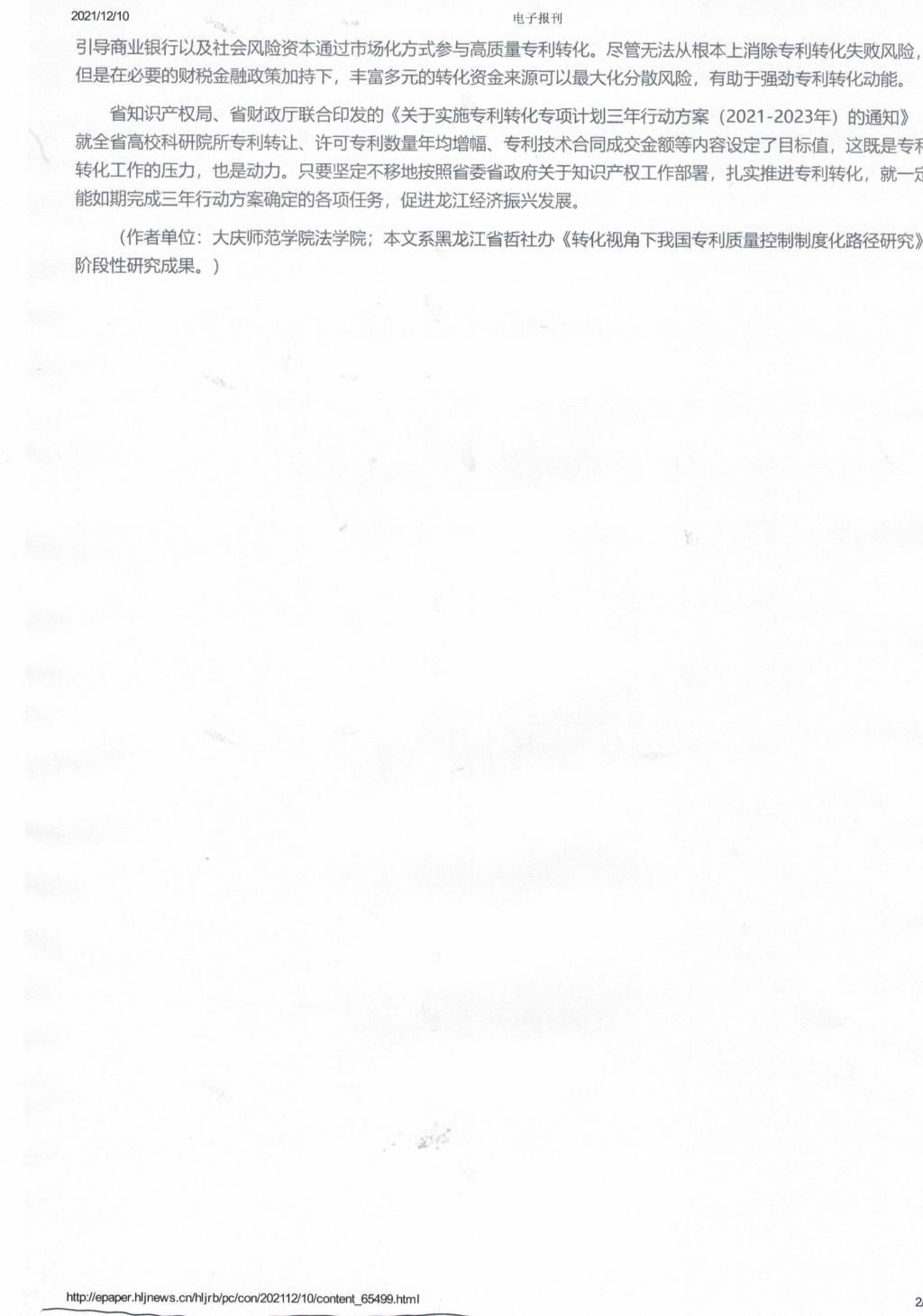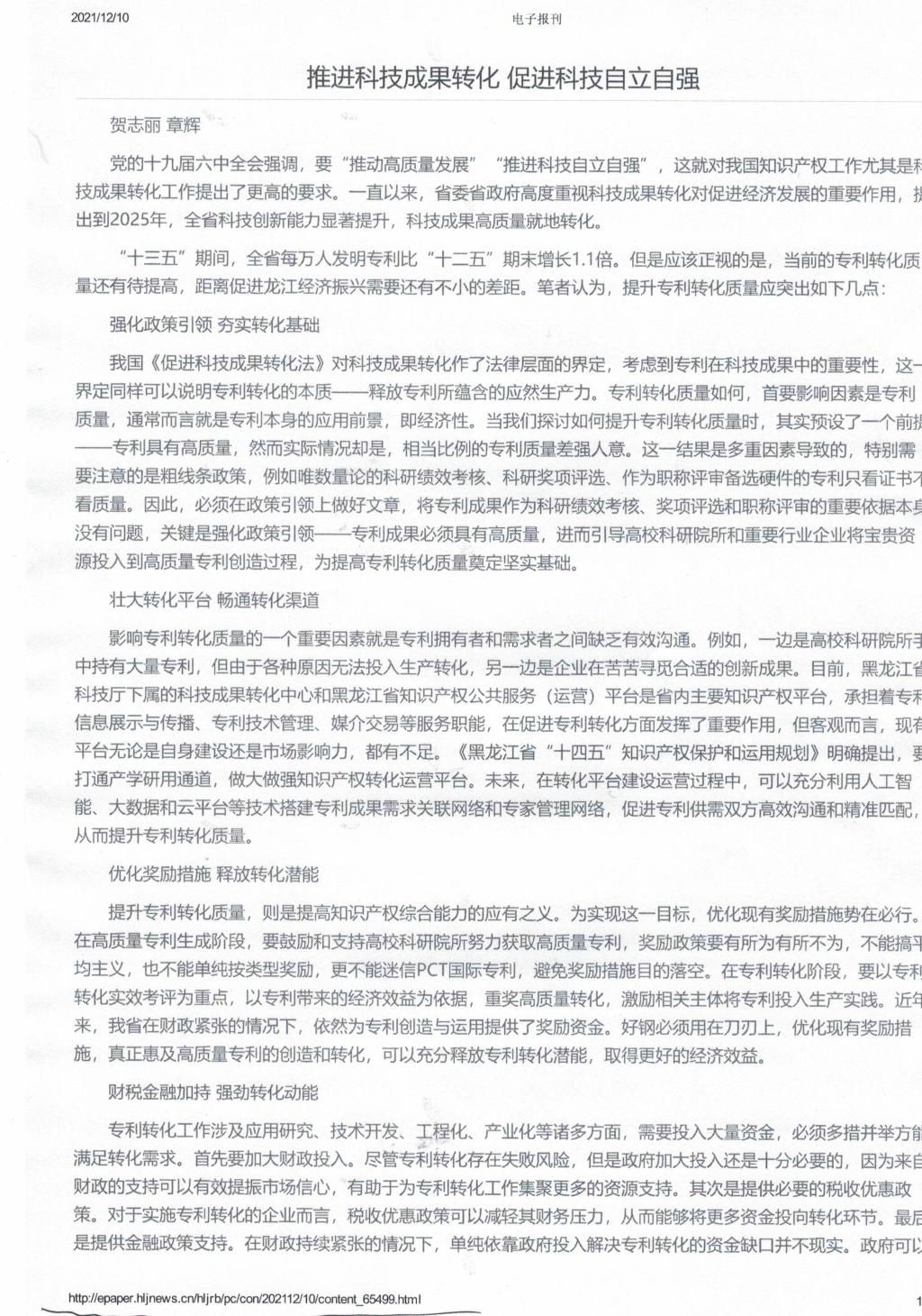 公司贺志丽博士(第一作者)撰写的论文《推进科技成果转化促进科技自立自强》发表于2021年12月10日出版的《黑龙江日报》,文章以党的十九届六中全会精神为指引,结合我省科技成果转化现状,回应龙江经济振兴发展需求,从“强化政策引领 夯实转化基础”、“壮大转化平台 畅通转化渠道”、“优化奖励措施 释放转化潜能”、“财税金融加持 强劲转化动能”等四个方面,提出了提高专利转化质量的政策建议。