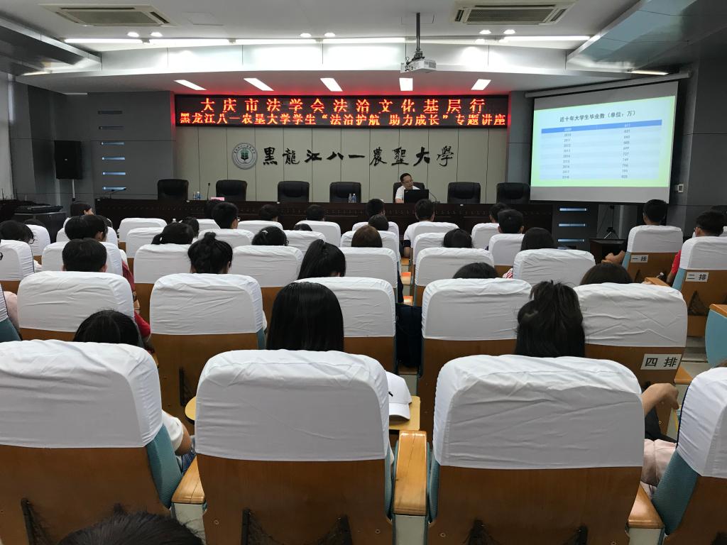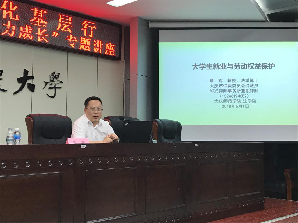 2018年6月1日晚,公司章辉教授应邀参加了大庆市法学会举办的法治文化基层行活动,并在黑龙江八一农垦大学主楼1043会议室为同学们作了题为“老员工就业与劳动权益保护”的专题讲座。讲座内容主要围绕《劳动法》、《劳动合同法》、《劳动争议调解仲裁法》、《劳动合同法实施条例》等重要劳动法律法规展开,重点讲解和分析了就业协议与劳动合同的关系,劳动合同必备条款,劳动合同效力,劳动者应有权利,劳动合同试用期约定,劳动合同解除权规定,经济补偿金和赔偿金,违约金制度设计,劳动争议范围,以及劳动仲裁和诉讼的衔接等15个同学们关心和关注的问题。