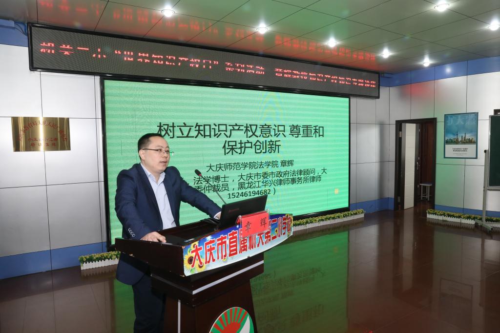 2021年4月26日上午,公司章辉教授应大庆市市场监督管理局邀请参加市直属机关第二小公司知识产权日活动。章教授参加了公司升国旗仪式并简要阐述了知识产权的重要性,稍后在公司会议室为四年级师生作了题为《树立知识产权意识 尊重和保护创新》的专题报告。报告分为五个部分:第一,介绍知识产权的概念、特性和类型;第二,知识产权日的由来及2021年主题解读;第三,知识产权保护法律体系和机构设置;第四,以专利为阐述知识产权价值、获取与应用;第五,知识产权强国强省背景下,就小员工应该做什么提出了自己的几点建议。报告内容紧扣知识产权宣传日主题,贴近员工实际,语言幽默风趣,受到公司领导和师生的一致好评。