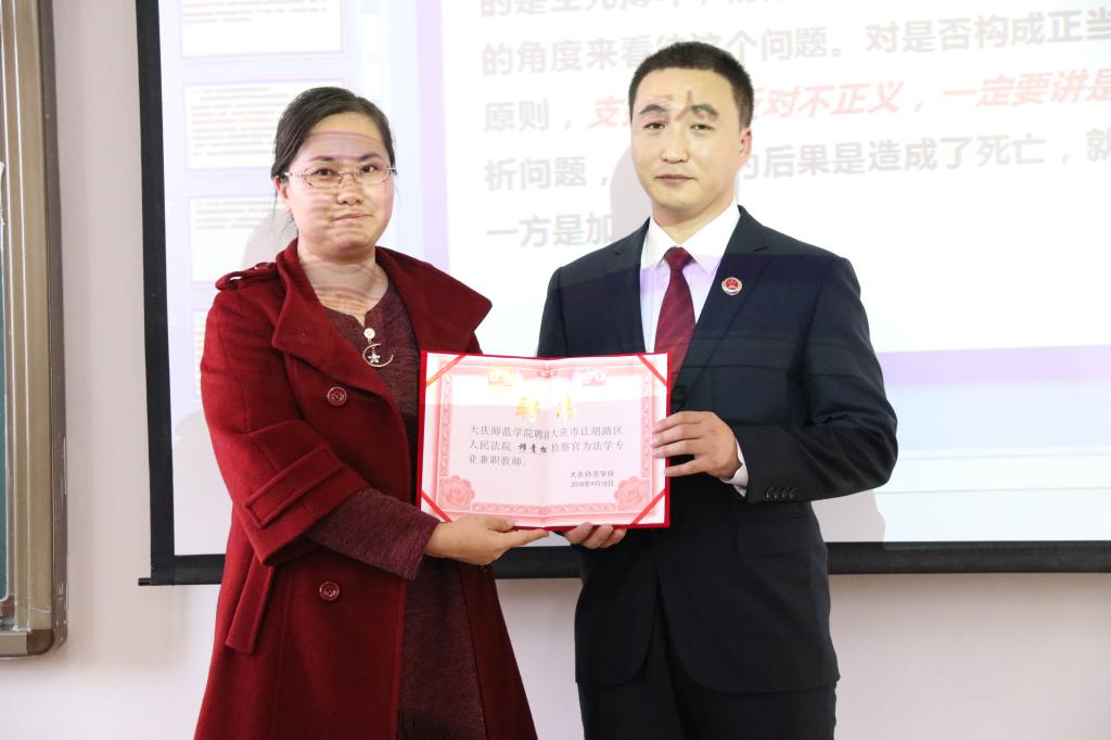 双师课堂共分为三个环节,第一部分由杨庆玲老师介绍案情并理论讲授正当防卫的构成条件,第二部分由六名同学组成辩论小组就此案进行了法庭论辩,第三部分由穆青松检察官从实务角度入手进行实践授课,最后杨庆玲为穆青松检察官颁发了兼职教师聘书。