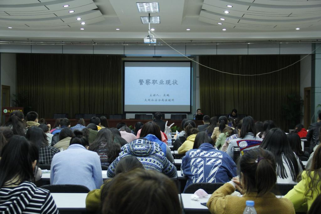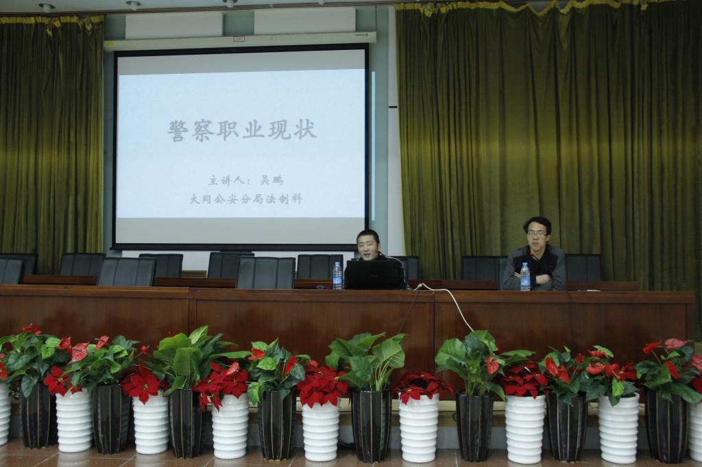 2016年4月22日下午6点在铁人讲堂举办了法庭教学课程的第四场报告会,由大同公安分局法制科吴鹏科长为伟德国际victor19462013、2014级员工做了题为“警察职业现状”的报告。