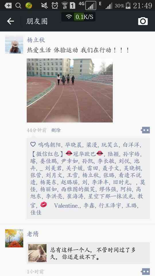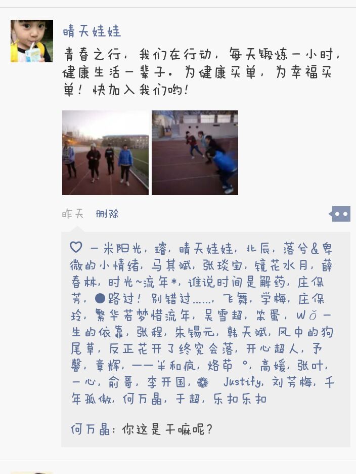 自开学以来,228寝室的关系十分融洽,寝室一直呈现和睦温馨的状态,并且寝室布置得井然有序,整洁大方,给人一种温馨上进的感觉。她们寝室有一个总是帮助她们的人那就是老六秋,还有一个总是给她们带快乐的老八雪。还有她们“三哥”英东,她总是那么的有范而且是在学习上帮助她们。她们四个人都很有运动细胞,杨立秋在高级俱乐部练习排球;尹幸如擅长跑步;杨英东擅长羽毛球;王雪擅长五十米冲刺。不仅这样,她们还经常早起跑步,锻炼身体,提高自身素质。她们热情洋溢,朝气蓬勃,热爱生活,热爱运动。她们满怀着青春的希望,奔跑在操场上。不惧严寒酷暑,坚持在锻炼。运动奏响生命,运动点燃激情,运动与她们的生命同在,健康与快乐永存!她们运动着,充满活力奔跑着,顺着阳光行走的方向,挥洒汗水,他们让青春闪耀光芒!奔跑中拥抱梦想,锻炼中强身健体。跑步是生命充满活力,她们的人生因体育勃发生机。快乐运动,健康生活开心每一天。