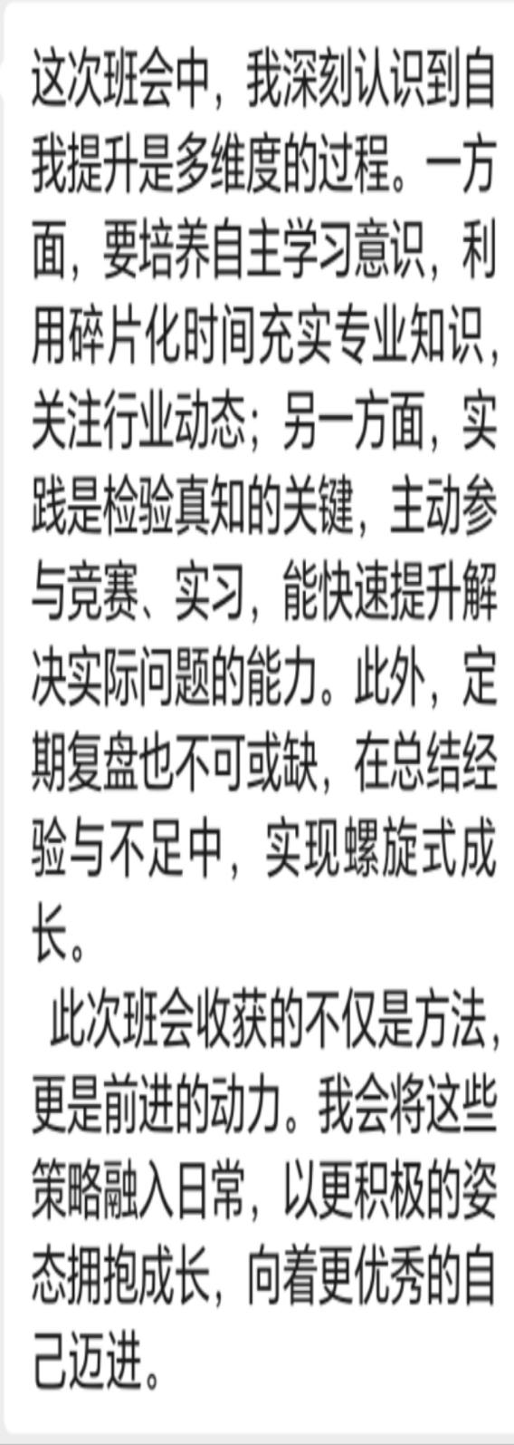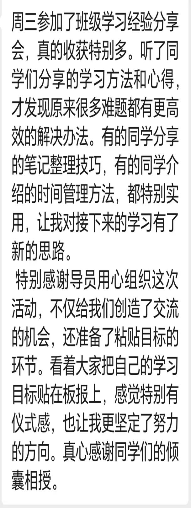 此外,关老师还指导2023级各班级组建学习互助小组,并设立若干奖项以激励同学们积极参与和相互督促。会后,同学们在微信群里分享自己的心得体会。