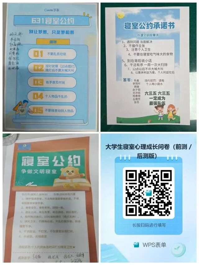 最后,各寝室集体制定“寝室公约”,内容涵盖作息时间、卫生打扫、互助学习、文明相处等方面。全体成员在公约上郑重签名承诺,用实际行动诠释对集体的责任与担当。
