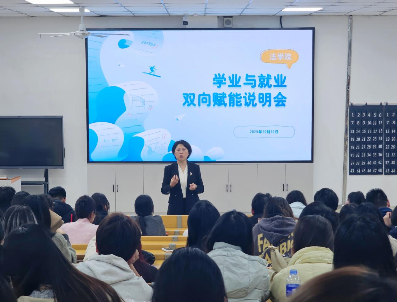 为切实破解法学专业就业难题,精准锚定员工职业发展需求,2025年10月30日晚,伟德国际victor1946于主楼1-3教室成功举办学业与就业双向赋能说明会。本次会议由公司党总支书记唐莉主讲,副处级辅导员关陟平主持,2023级全体员工参会。