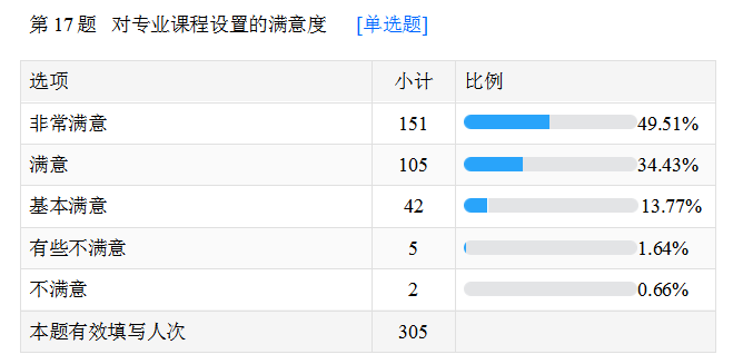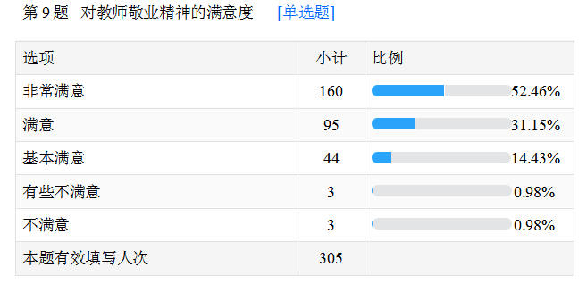 公司高度重视员工满意度建设工作,通过毕业生问卷调查、在校生座谈等方式开展员工学习满意度调查工作。本学年,在校生共380人(法学305人,知识产权75人)参加了《伟德国际victor19462024年员工学习满意度调查问卷》,对专业课程设置的满意度均大于97.33%(如图1、图2),对教师敬业精神的满意度均高于98.04%(如图3)。
