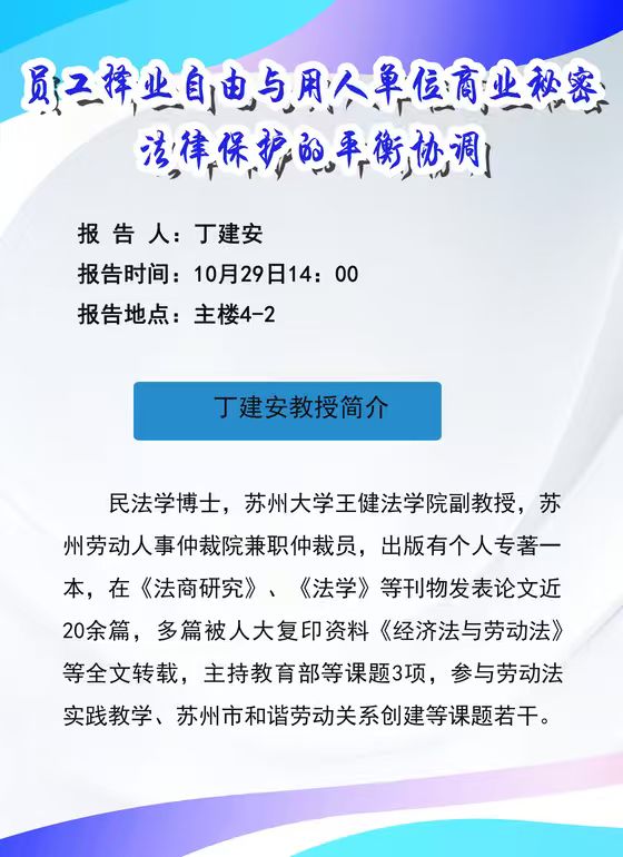 讲座通知|员工择业自由与用人单位商业秘密法律保护的平衡协调——丁建安