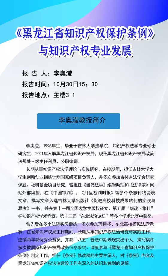 讲座通知|《黑龙江省知识产权保护条例》 与知识产权专业发展——李奥滢