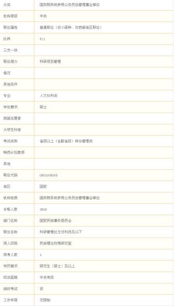 2012年国家公务员考试整体职位平均竞争比例为 65.5:1,竞争最激烈的职位是国家民族事务委员会民族理论政策研究室科研管理处主任科员及以下一职,4124人争抢一个职位。