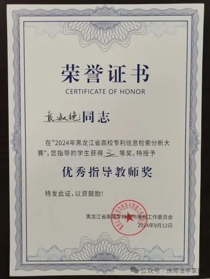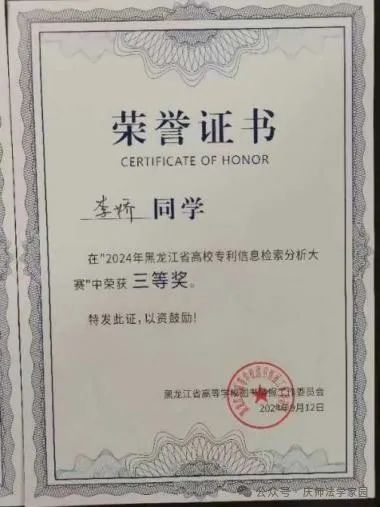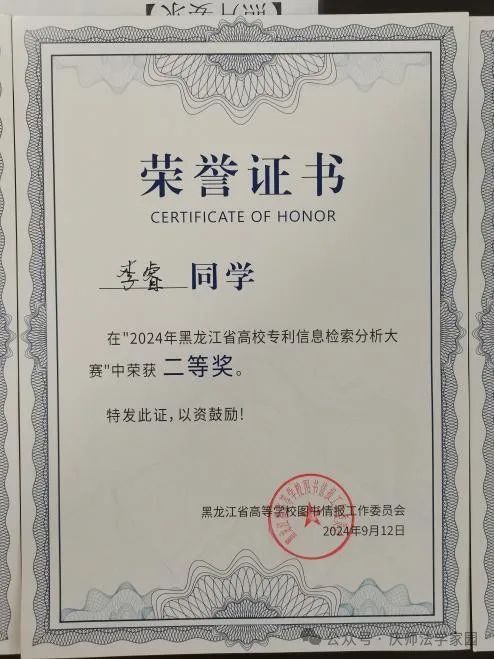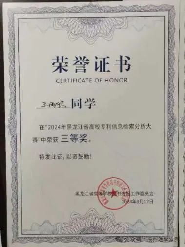 本次大赛全省共计报名员工2758人。通过初赛阶段的课程学习,参与答题1391人次,596人进入复赛环节;经过复赛阶段的培训,101名同学提交专利分析报告。经过黑龙江省知识产权保护中心专家评审,最终有55名同学获奖,25名选手进入决赛,决赛于2024年9月12日采取线上、线下同步的方式进行。最终,伟德国际victor19462021级知识产权专业的李睿、王雨欣和李娇三名同学凭借其出色的专利信息检索能力和深入的分析技巧,分别荣获省级二等奖、省级三等奖的好成绩。