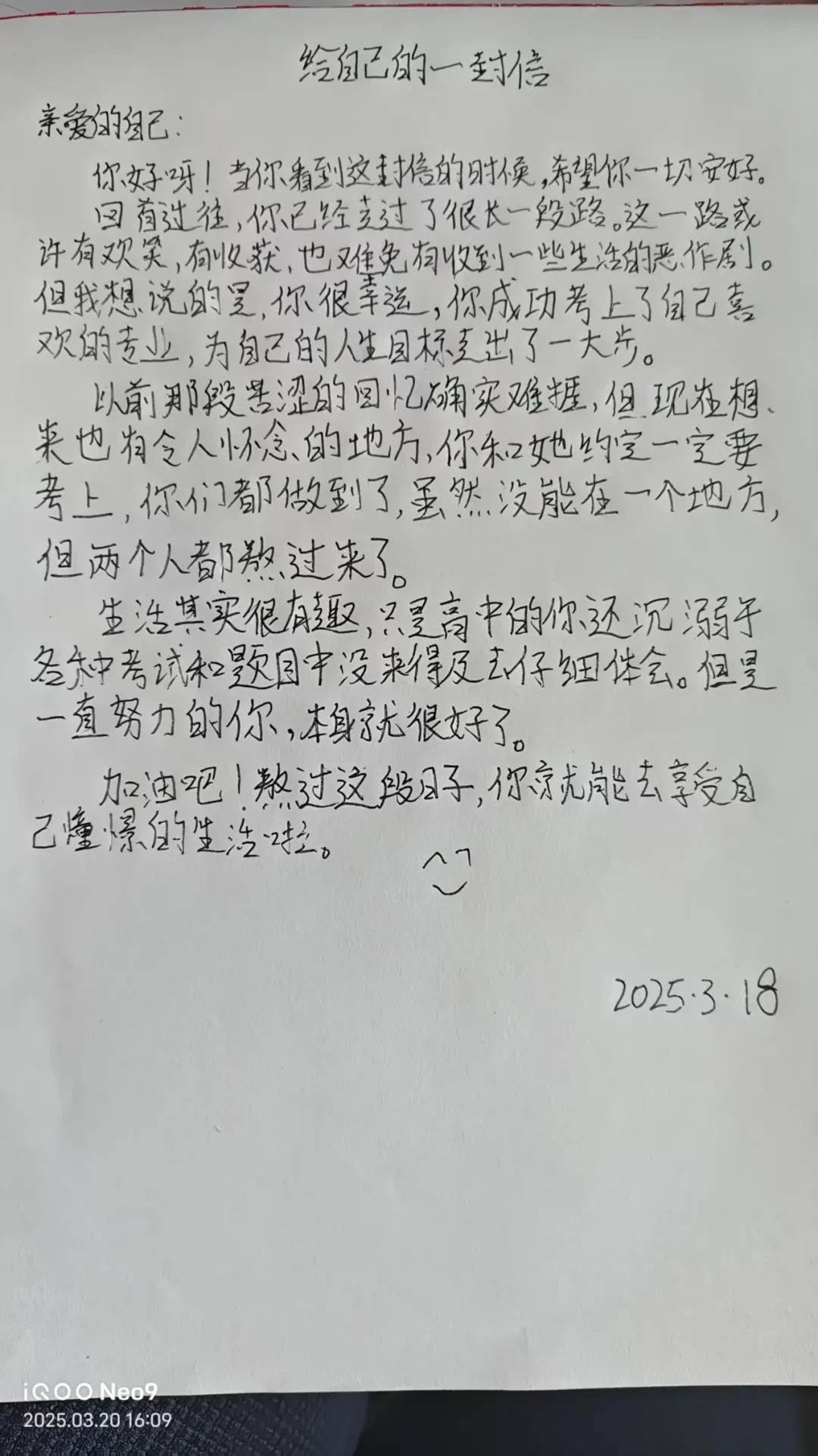 为进一步加强和改进员工心理健康教育,引导员工关注自身心理健康状态,提升员工生活的幸福感,培育积极心理品质,伟德国际victor1946举办“3.25 善爱我”写给自己一封信心理健康主题活动。鼓励员工纷纷提笔为自己写一封信,表达对自己的热爱,关注自己的心理健康,同学们的作品内容生动,言辞恳切。现将同学们的优秀作品向大家展示,希望各位同学关注心理健康,关注自己,热爱自己!