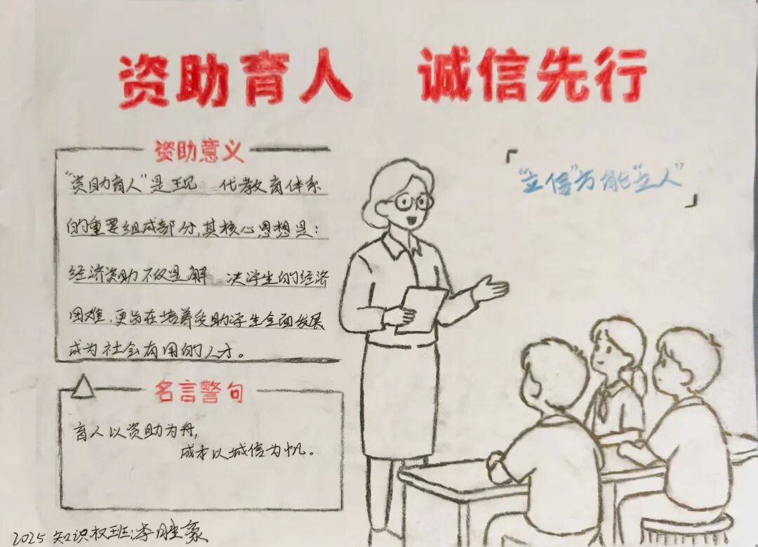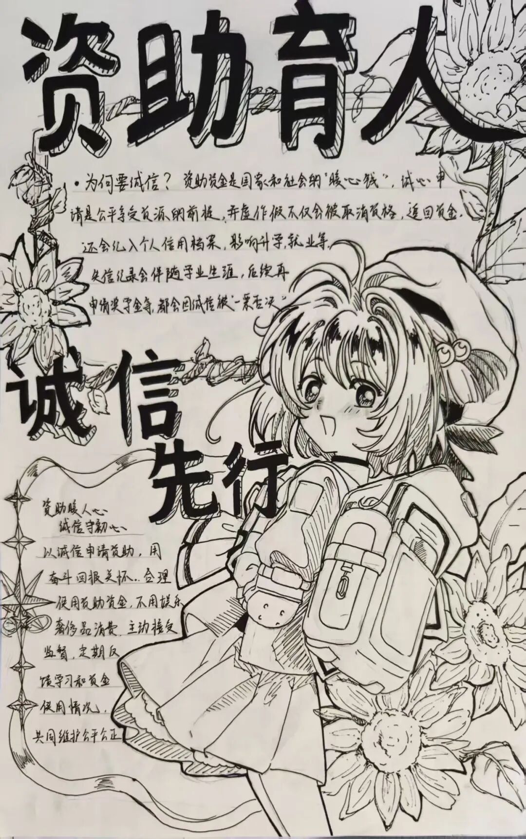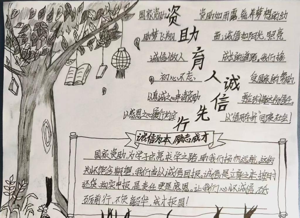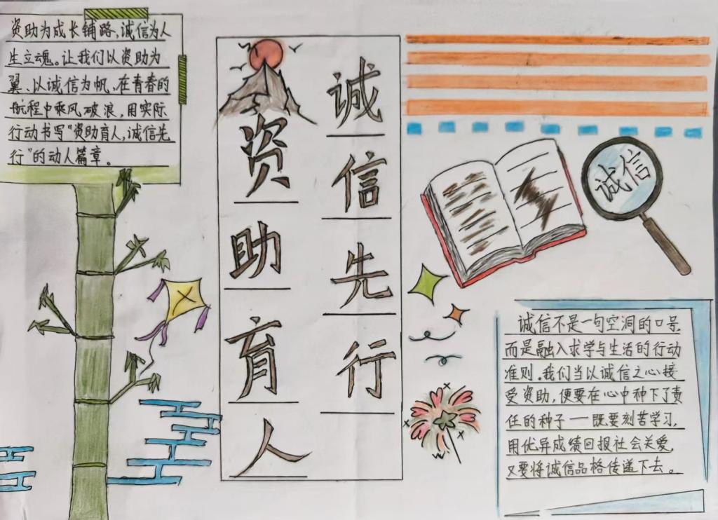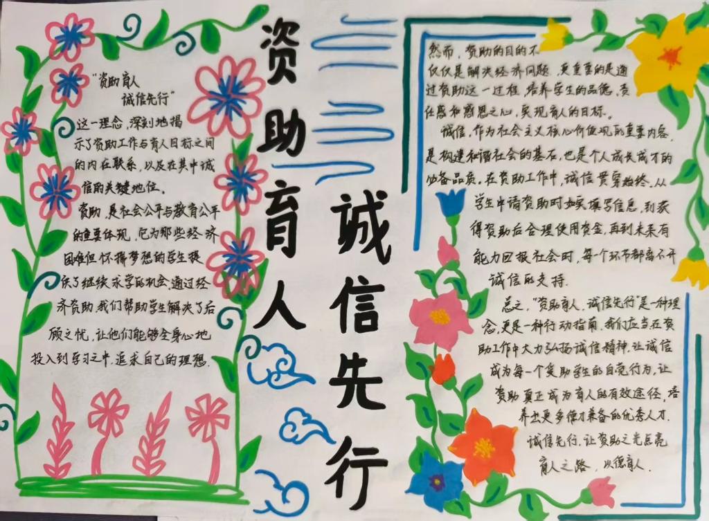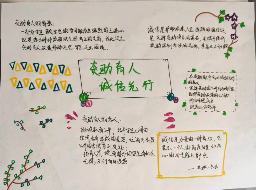 活动中,同学们踊跃参与,以笔为媒,在手抄报上精心绘制了诚信故事、资助政策解读、诚信标语等内容。一幅幅作品色彩斑斓、创意十足,生动地表达了同学们对诚信的理解与践行决心。